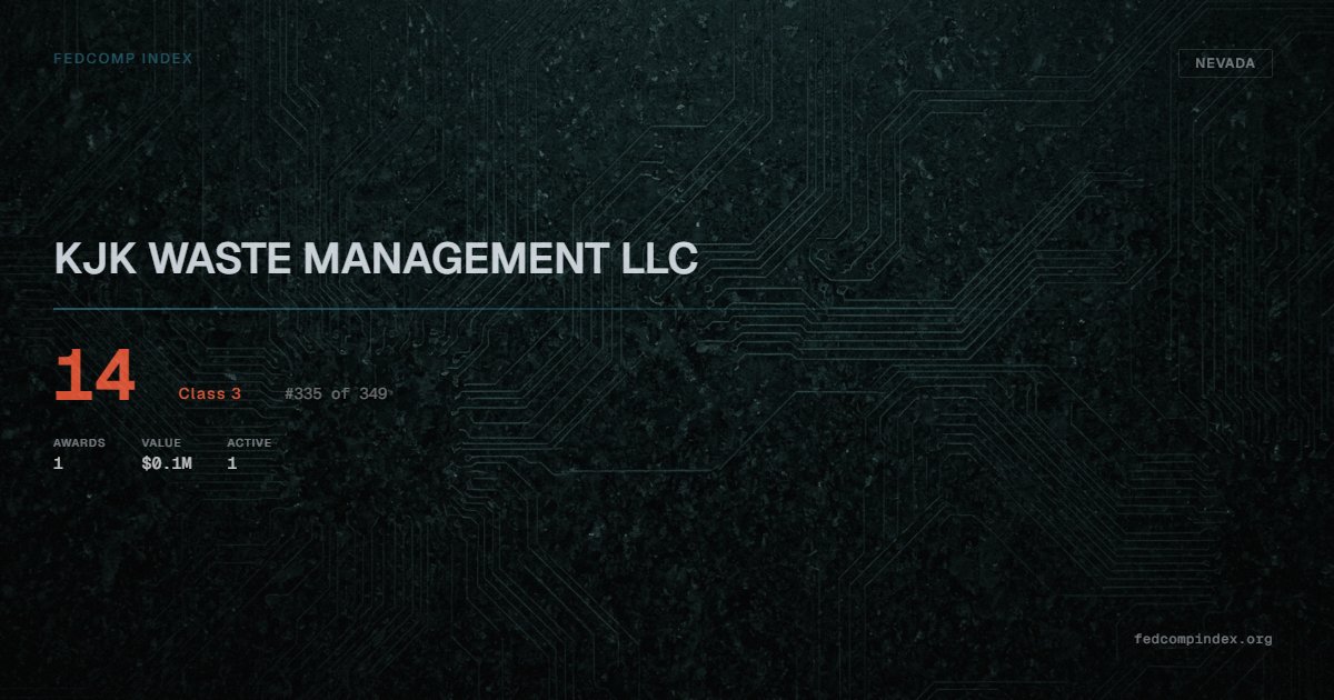 KJK WASTE MANAGEMENT LLC holds position #335 among 349 Nevada federal contractors scored by the FedComp Index at 14. Contract records show $0.1M in federal awards over the five-year scoring window. All recorded awards come from Department of the Interior. One contract currently active. Last recorded award dates to 2021. Top competitors by award overlap include LOGISTICAL SOLUTIONS LLC and WATERS SEPTIC TANK SERVICE.