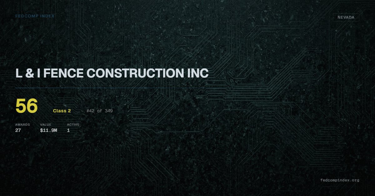 L & I FENCE CONSTRUCTION INC is a Nevada-based federal contractor ranked #42 of 349 with a FedComp Index score of 56. Federal contract history shows $11.9M across 27 awards in the past five years. Awards span Department of Agriculture and Department of the Interior. One contract currently active. Last award dated July 2025. Top competitors by award overlap include AVENTUS NV, INC. and SENTINEL BUILDERS, LLC.