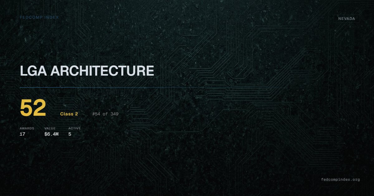 LGA ARCHITECTURE is a Nevada-based federal contractor ranked #54 of 349 with a FedComp Index score of 52. Award records total $6.4M from 17 federal contracts over five years. All recorded awards come from Department of the Interior. Has 5 active contracts on record. Last award dated November 2025. Top competitors by award overlap include TELESECURITY SCIENCES, INC. and S&B CHRIST CONSULTING, LLC.