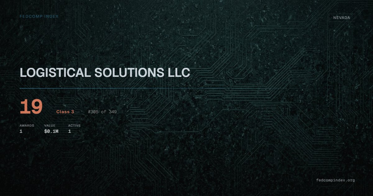 LOGISTICAL SOLUTIONS LLC holds position #305 among 349 Nevada federal contractors scored by the FedComp Index at 19. Contract records show $0.1M in federal awards over the five-year scoring window. All recorded awards come from Department of the Interior. One contract currently active. Last recorded award dates to 2024. Top competitors by award overlap include WATERS SEPTIC TANK SERVICE and KJK WASTE MANAGEMENT LLC.