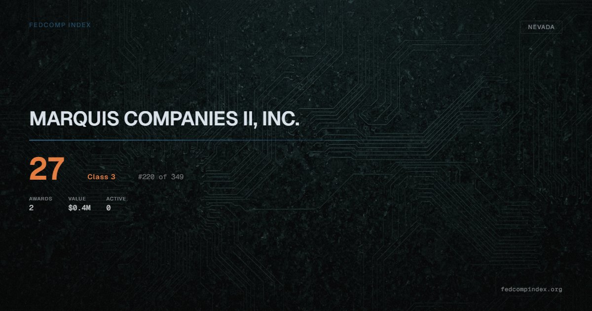 MARQUIS COMPANIES II, INC. holds position #220 among 349 Nevada federal contractors scored by the FedComp Index at 27. Contract records show $0.4M in federal awards over the five-year scoring window. All recorded awards come from Department of Veterans Affairs. Last recorded award dates to 2024. Closest competitor by award overlap is WILDCREEK HEALTHCARE, INC..