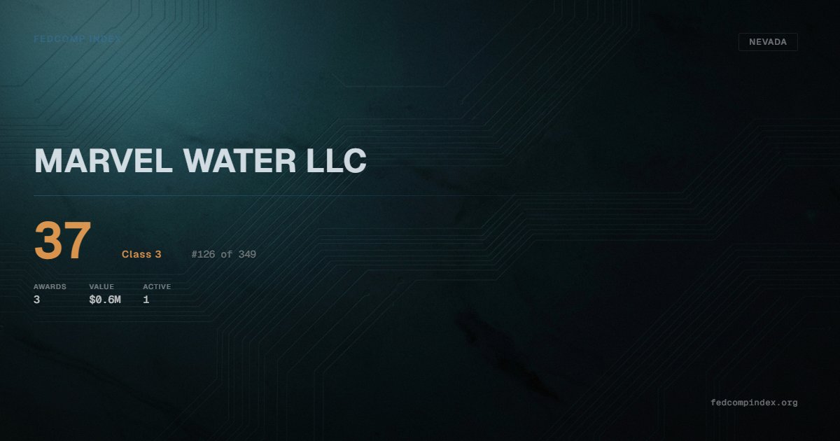 MARVEL WATER LLC holds position #126 among 349 Nevada federal contractors scored by the FedComp Index at 37. Contract records show $0.6M in federal awards over the five-year scoring window. Awards span Department of Defense and Department of Veterans Affairs. One contract currently active. Last award dated September 2025. Top competitors by award overlap include CATALINA IMAGING, INC and KYLE MOUNTAIN FIRE LLC.
