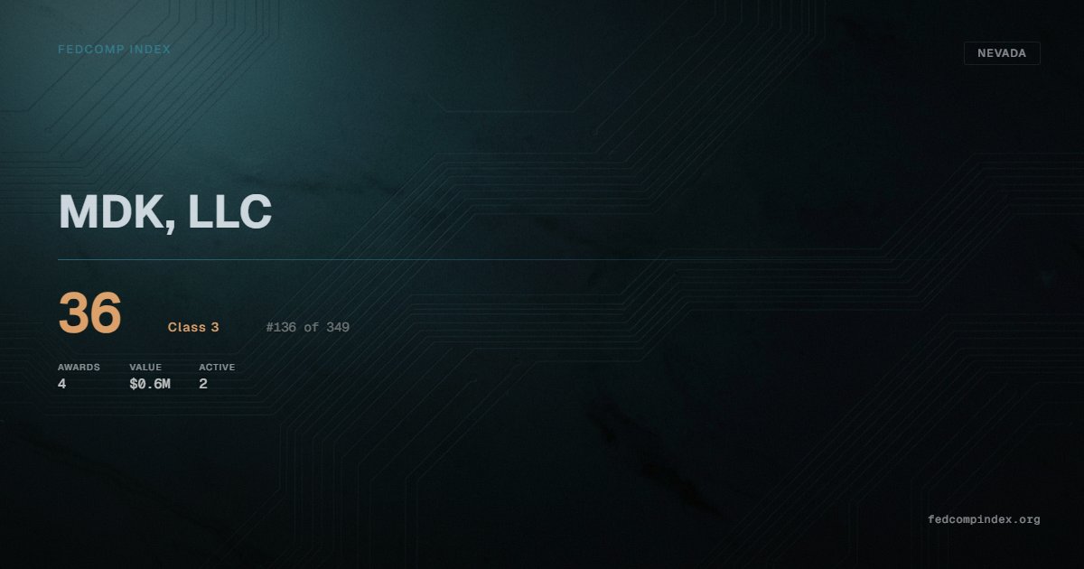 MDK, LLC holds position #136 among 349 Nevada federal contractors scored by the FedComp Index at 36. Contract records show $0.6M in federal awards over the five-year scoring window. All recorded awards come from Department of the Interior. 2 contracts currently active. Most recent contract activity from early 2025. Top competitors by award overlap include CHEMEON SURFACE TECHNOLOGY, LLC and LBT DIAGNOSTIC RADIATION PHYSICS CONSULTING LTD.