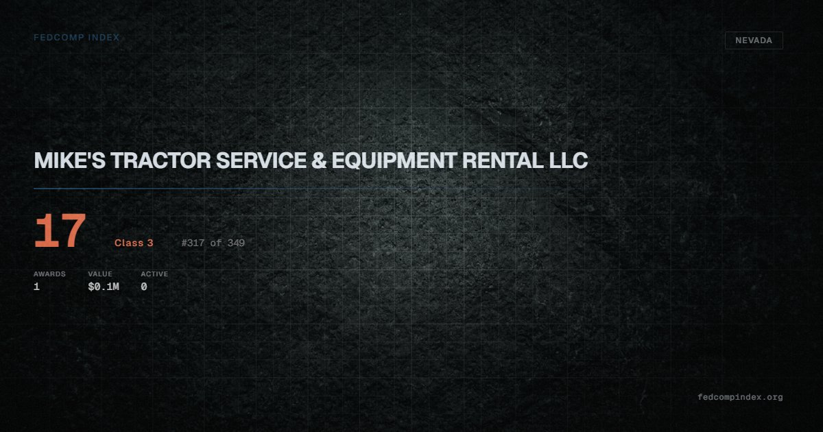 MIKE'S TRACTOR SERVICE & EQUIPMENT RENTAL LLC holds position #317 among 349 Nevada federal contractors scored by the FedComp Index at 17. Contract records show $0.1M in federal awards over the five-year scoring window. All recorded awards come from Department of Agriculture. Last recorded award dates to 2023. Top competitors by award overlap include GOMEZ TRANSPORT LLC and CRIDDLE CONTRACTING, LLC.