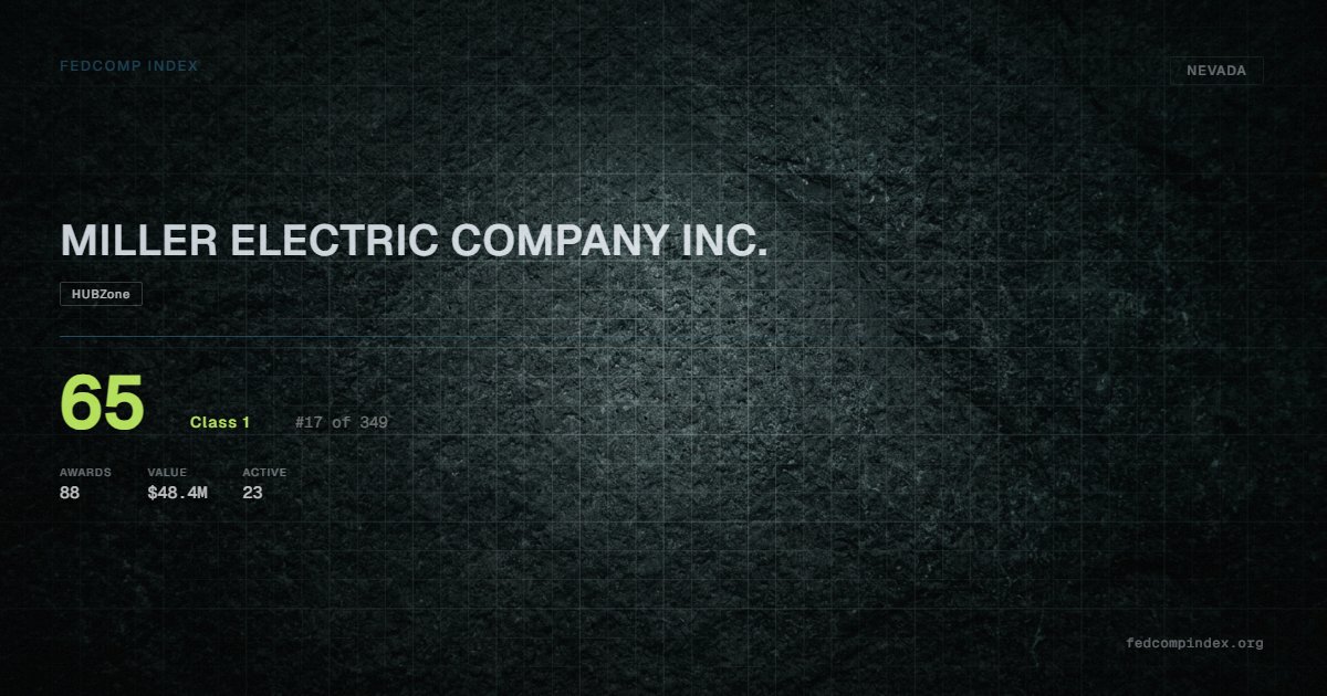 MILLER ELECTRIC COMPANY INC. is a Class 1 Nevada federal contractor with a FedComp Index score of 65, ranked #17 of 349. Federal contract history shows $48.4M across 88 awards in the past five years. Awards span Department of Defense and Department of the Interior. Carries an active HUBZone certification. Currently managing 23 active contracts. Most recent award recorded in February 2026. Top competitors by award overlap include AVENTUS NV, INC. and MIWOK CONSTRUCTION LLC.