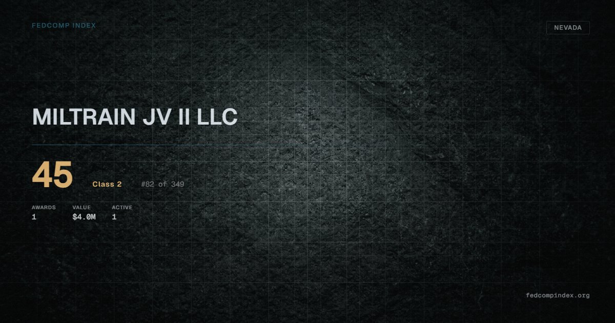 MILTRAIN JV II LLC is a Nevada-based federal contractor ranked #82 of 349 with a FedComp Index score of 45. Award records total $4.0M from 1 federal contracts over five years. All recorded awards come from Department of Defense. One contract currently active. Last recorded award dates to 2024. Top competitors by award overlap include DELMAR AEROSPACE CORPORATION and OREADY LLC.