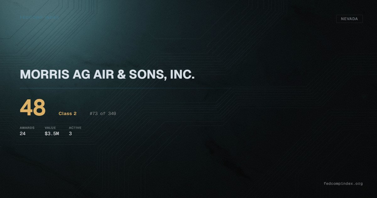 MORRIS AG AIR & SONS, INC. is a Nevada-based federal contractor ranked #73 of 349 with a FedComp Index score of 48. Award records total $3.5M from 24 federal contracts over five years. Awards span Department of Agriculture and Department of the Interior. 3 contracts currently active. Most recent award recorded in March 2026. Top competitors by award overlap include MANFORD C GLOCK and COMSTOCK SEED LLC.