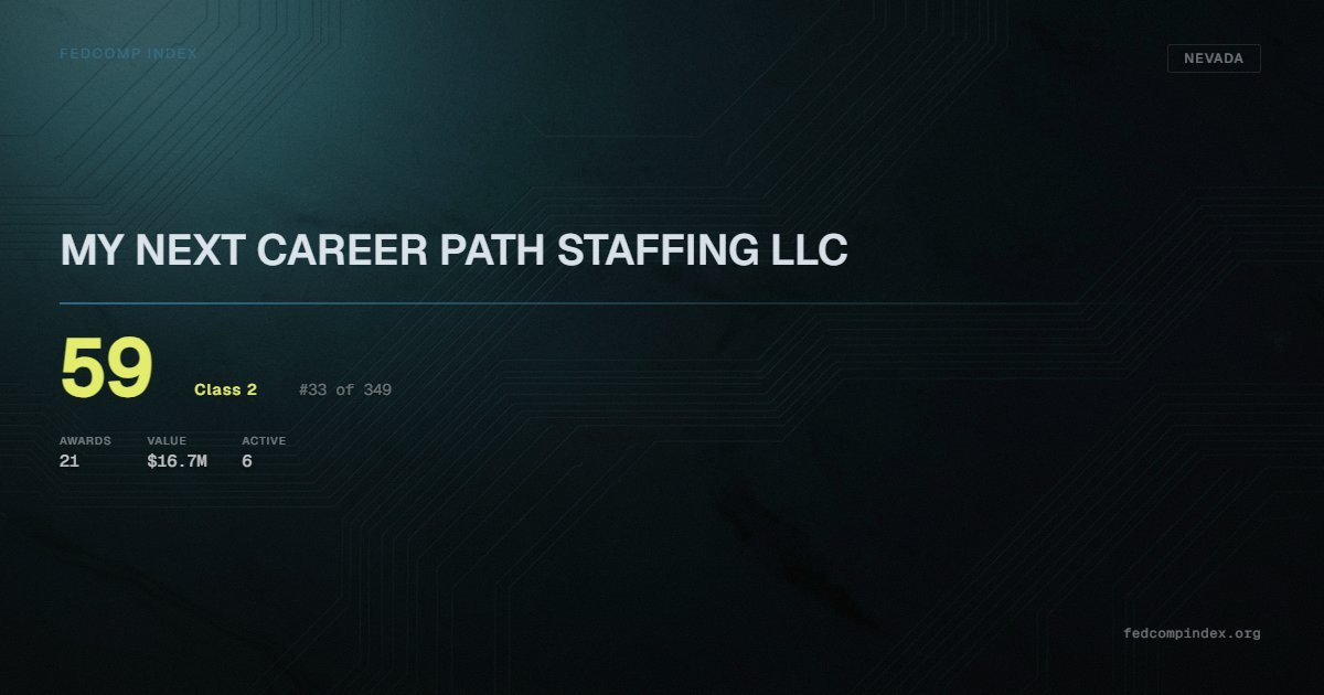MY NEXT CAREER PATH STAFFING LLC is a Nevada-based federal contractor ranked #32 of 349 with a FedComp Index score of 59. Federal contract history shows $16.7M across 21 awards in the past five years. Awards span Department of Defense and Department of the Interior. Has 6 active contracts on record. Last award dated July 2025. Top competitors by award overlap include THE SIEGEL GROUP, LLC and BEAVERFIT NORTH AMERICA LLC.