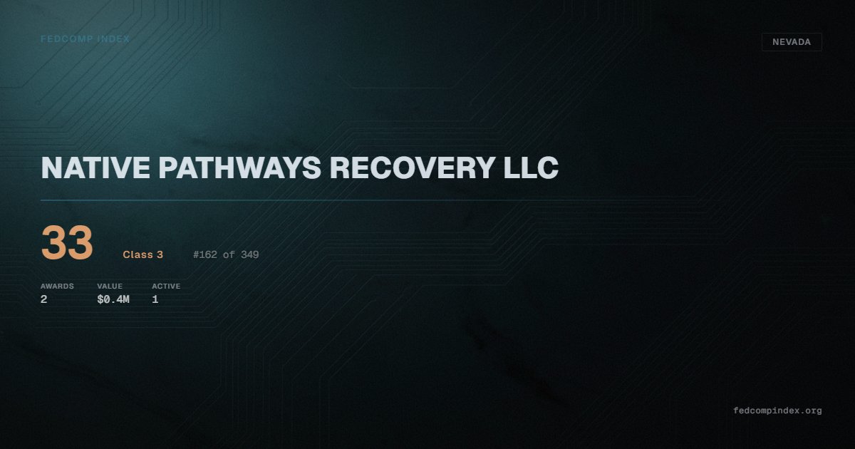 NATIVE PATHWAYS RECOVERY LLC holds position #162 among 349 Nevada federal contractors scored by the FedComp Index at 33. Contract records show $0.4M in federal awards over the five-year scoring window. All recorded awards come from Department of Veterans Affairs. One contract currently active. Last award dated August 2025.