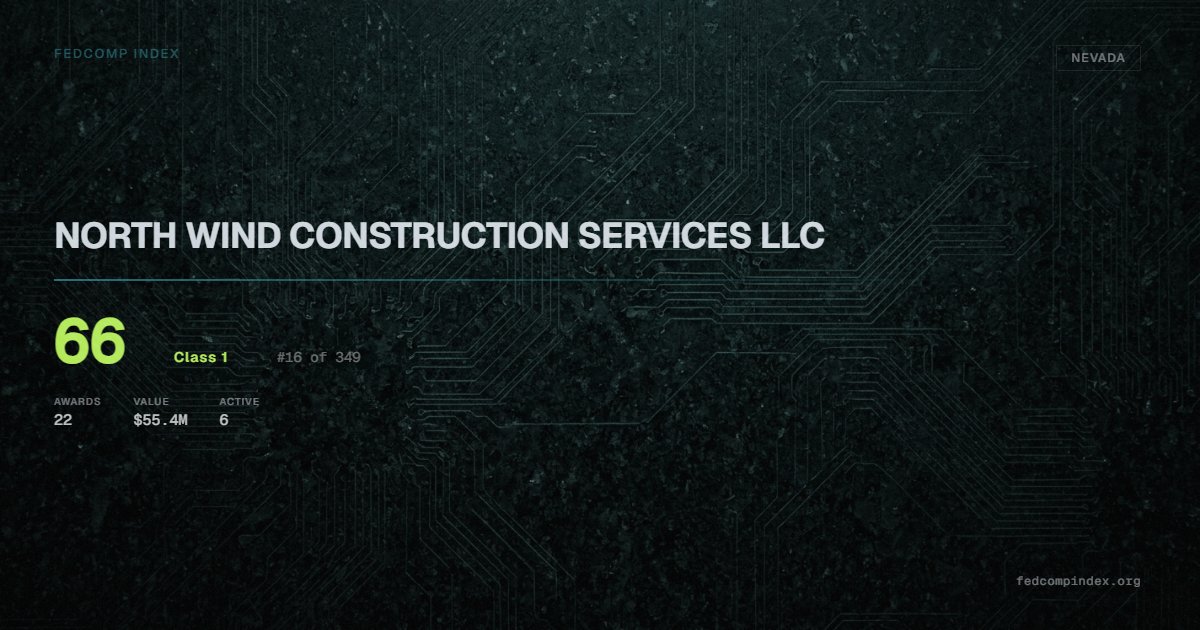NORTH WIND CONSTRUCTION SERVICES LLC is a Class 1 Nevada federal contractor with a FedComp Index score of 66, ranked #16 of 349. Over five years, NORTH WIND CONSTRUCTION SERVICES LLC has secured $55.4M in federal contract value from 22 awards. All recorded awards come from Department of Defense. Has 6 active contracts on record. Last award dated September 2025. Top competitors by award overlap include AVENTUS NV, INC. and PUYENPA CONSTRUCTION, LLC.