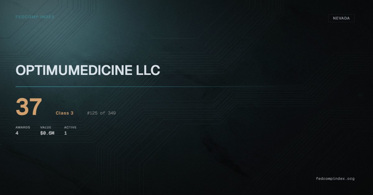 OPTIMUMEDICINE LLC holds position #125 among 349 Nevada federal contractors scored by the FedComp Index at 37. Contract records show $0.6M in federal awards over the five-year scoring window. All recorded awards come from Department of Veterans Affairs. One contract currently active. Most recent award recorded in January 2026. Top competitors by award overlap include DOLJENN PERFORMANCE CONSULTING LLC and CS EDUCATIONAL SERVICES LLC.