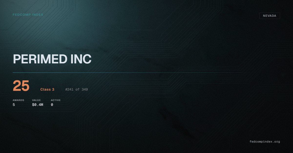 PERIMED INC holds position #241 among 349 Nevada federal contractors scored by the FedComp Index at 25. Contract records show $0.4M in federal awards over the five-year scoring window. Awards span Department of Health and Human Services and Department of Veterans Affairs. Last recorded award dates to 2022. Top competitors by award overlap include NEVADA ORTHOTICS & PROSTHETICS, INC. and VADATECH INC.