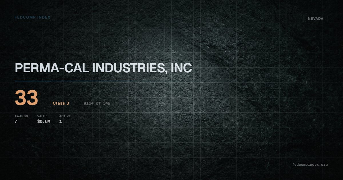 PERMA-CAL INDUSTRIES, INC holds position #164 among 349 Nevada federal contractors scored by the FedComp Index at 33. Contract records show $0.6M in federal awards over the five-year scoring window. All recorded awards come from Department of Defense. One contract currently active. Most recent contract activity from early 2025. Top competitors by award overlap include SABLE SYSTEMS INTERNATIONAL, INC and QUIXLE LLC.
