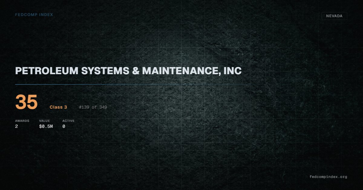 PETROLEUM SYSTEMS & MAINTENANCE, INC holds position #139 among 349 Nevada federal contractors scored by the FedComp Index at 35. Contract records show $0.5M in federal awards over the five-year scoring window. All recorded awards come from Department of Veterans Affairs. Last award dated October 2025. Top competitors by award overlap include JP GENERAL INC and AJ INDUSTRIES WEST, INC..