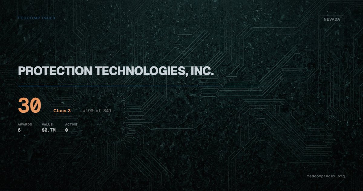 PROTECTION TECHNOLOGIES, INC. holds position #193 among 349 Nevada federal contractors scored by the FedComp Index at 30. Contract records show $0.7M in federal awards over the five-year scoring window. All recorded awards come from Department of Defense. Last recorded award dates to 2024. Top competitors by award overlap include SUNDANCE DIGITAL SIGNAL PROCESSING INC and TEKTON CC, LLC.
