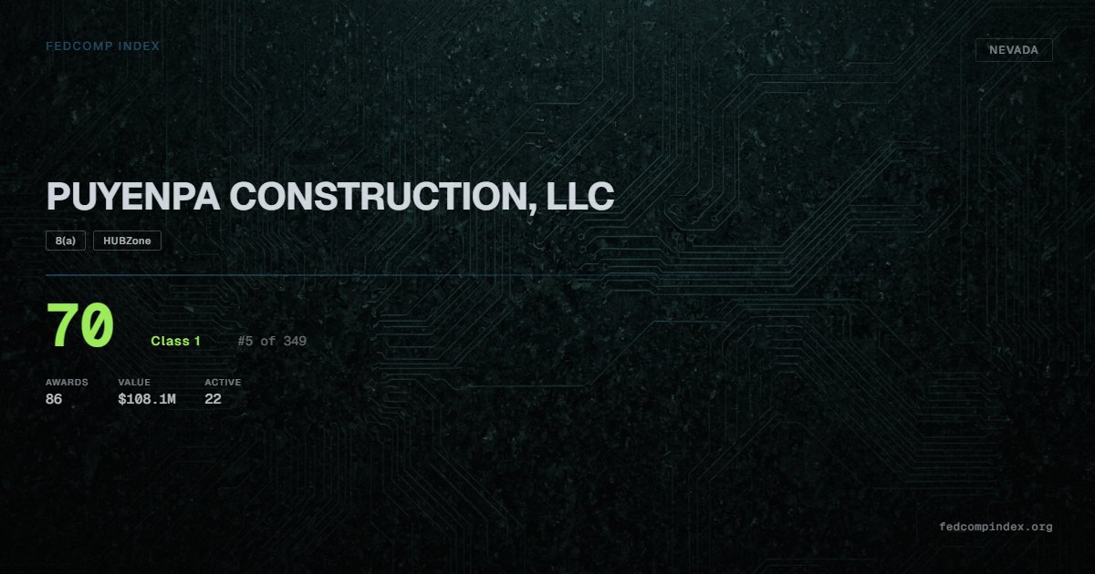 PUYENPA CONSTRUCTION, LLC scores 70 out of 100 on the FedComp Index, ranking #5 of 349 scored Nevada contractors. Five-year federal contract volume totals $108.1M from 86 awards. Contract history spans 4 federal agencies including Department of Defense. Certified as 8(a) and HUBZone through the SBA. Currently managing 22 active contracts. Most recent award recorded in March 2026. Top competitors by award overlap include MIWOK CONSTRUCTION LLC and PUYENPA SERVICES, LLC.