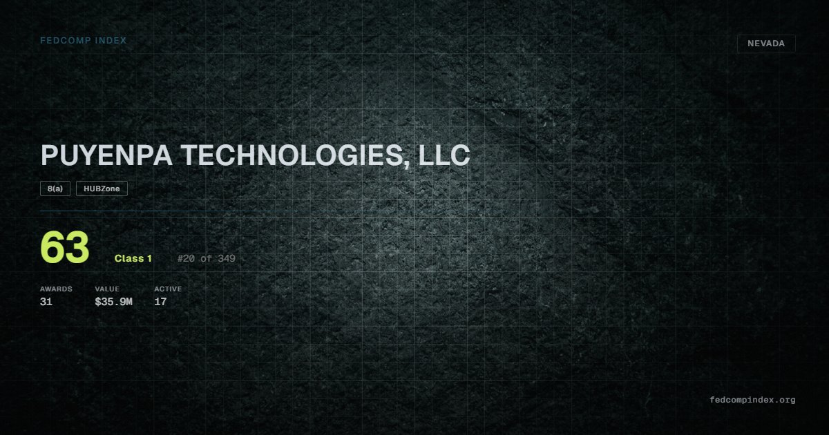 PUYENPA TECHNOLOGIES, LLC is a Class 1 Nevada federal contractor with a FedComp Index score of 63, ranked #20 of 349. Federal contract history shows $35.9M across 31 awards in the past five years. Contract history spans 5 federal agencies including Department of Defense. Certified as 8(a) and HUBZone through the SBA. Currently managing 17 active contracts. Last award dated November 2025. Top competitors by award overlap include MILLER ELECTRIC COMPANY INC. and UNIQUE COMMUNICATIONS SOLUTIONS.