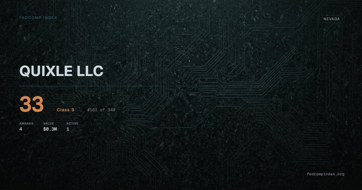 QUIXLE LLC holds position #161 among 349 Nevada federal contractors scored by the FedComp Index at 33. Contract records show $0.3M in federal awards over the five-year scoring window. Contracts come from Department of Defense, Department of Justice, and Department of the Interior. One contract currently active. Last award dated September 2025. Top competitors by award overlap include AURELIA TECHNOLOGIES, INC and SUTTER EQUIPMENT COMPANY, INC..
