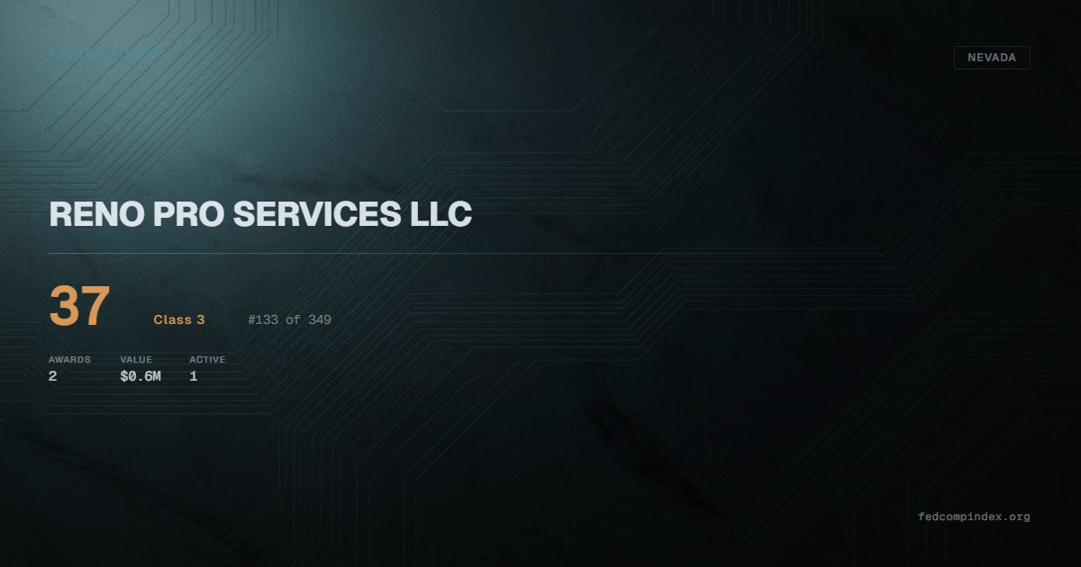 RENO PRO SERVICES LLC holds position #133 among 349 Nevada federal contractors scored by the FedComp Index at 37. Contract records show $0.6M in federal awards over the five-year scoring window. All recorded awards come from Department of Veterans Affairs. One contract currently active. Last award dated November 2025. Closest competitor by award overlap is HENRIKSEN BUTLER NEVADA, LLC.