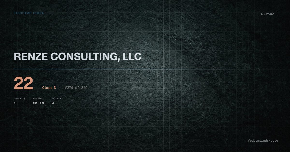 RENZE CONSULTING, LLC holds position #270 among 349 Nevada federal contractors scored by the FedComp Index at 22. Contract records show $0.1M in federal awards over the five-year scoring window. All recorded awards come from Department of Defense. Last award dated August 2025. Top competitors by award overlap include REDWOOD MATERIALS INC and THE TONE KNOWS INC.