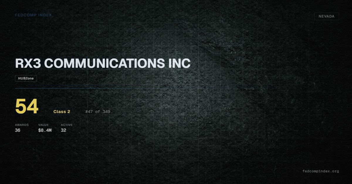 RX3 COMMUNICATIONS INC is a Nevada-based federal contractor ranked #47 of 349 with a FedComp Index score of 54. Award records total $8.4M from 36 federal contracts over five years. Contracts come from Department of Defense, Department of Veterans Affairs, and Department of the Interior. Carries an active HUBZone certification. Currently managing 32 active contracts. Last award dated September 2025. Top competitors by award overlap include JTM ENTERPRISES LLC and UNIQUE COMMUNICATIONS SOLUTIONS.