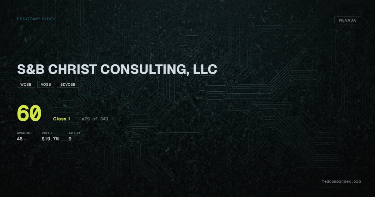S&B CHRIST CONSULTING, LLC is a Class 1 Nevada federal contractor with a FedComp Index score of 60, ranked #29 of 349. Federal contract history shows $19.7M across 48 awards in the past five years. Contracts come from Department of Defense, Department of Veterans Affairs, and Department of the Interior. SBA-certified as WOSB, VOSB, and SDVOSB. Has 9 active contracts on record. Last award dated September 2025. Top competitors by award overlap include LIRA ELECTRIC, LLC and AVENTUS NV, INC..