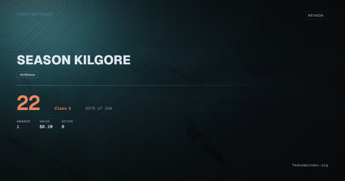 SEASON KILGORE holds position #276 among 349 Nevada federal contractors scored by the FedComp Index at 22. Contract records show $0.1M in federal awards over the five-year scoring window. All recorded awards come from Department of Agriculture. Carries an active HUBZone certification. Last recorded award dates to 2024. Top competitors by award overlap include GOMEZ TRANSPORT LLC and CRIDDLE CONTRACTING, LLC.