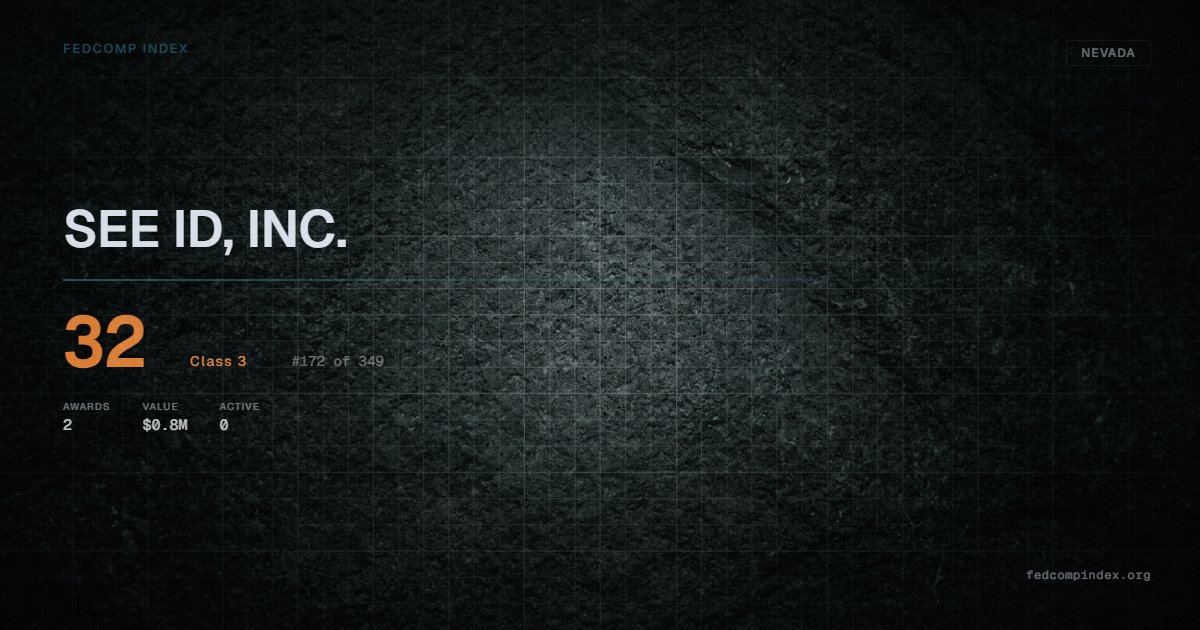 SEE ID, INC. holds position #172 among 349 Nevada federal contractors scored by the FedComp Index at 32. Contract records show $0.8M in federal awards over the five-year scoring window. All recorded awards come from Department of Defense. Last recorded award dates to 2023. Top competitors by award overlap include EO SOLUTIONS CORP and ERG AEROSPACE CORPORATION.