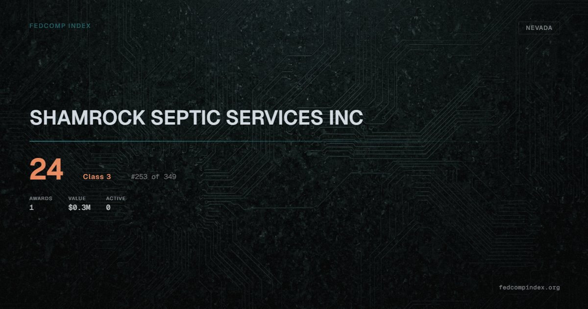 SHAMROCK SEPTIC SERVICES INC holds position #253 among 349 Nevada federal contractors scored by the FedComp Index at 24. Contract records show $0.3M in federal awards over the five-year scoring window. All recorded awards come from Department of Agriculture. Last recorded award dates to 2021. Top competitors by award overlap include G BAR L, LLC and KKS WATER SERVICE INC.