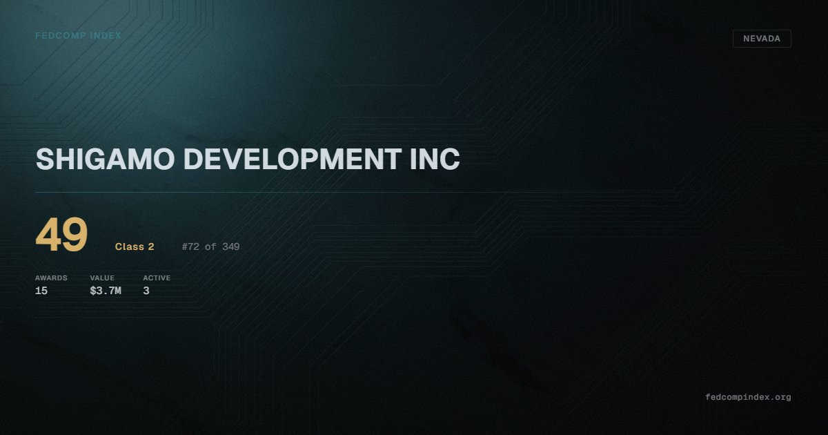 SHIGAMO DEVELOPMENT INC is a Nevada-based federal contractor ranked #72 of 349 with a FedComp Index score of 49. Award records total $3.7M from 15 federal contracts over five years. All recorded awards come from Department of Defense. 3 contracts currently active. Last award dated December 2025. Top competitors by award overlap include CONNECTORS PLUS LLC and BIGHORN SOLUTIONS LLC.