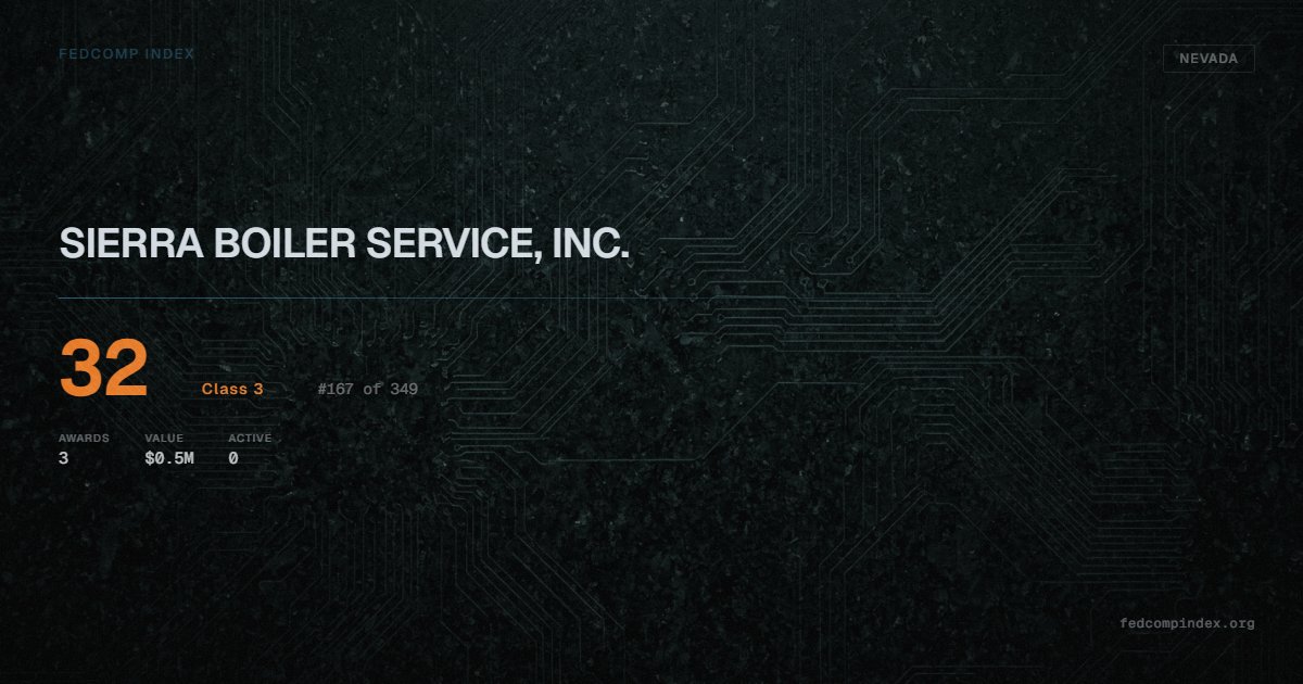 SIERRA BOILER SERVICE, INC. holds position #167 among 349 Nevada federal contractors scored by the FedComp Index at 32. Contract records show $0.5M in federal awards over the five-year scoring window. All recorded awards come from Department of Veterans Affairs. Most recent contract activity from early 2025. Top competitors by award overlap include TEKTON CC, LLC and PATRIOT AIR CONDITIONING LLC.