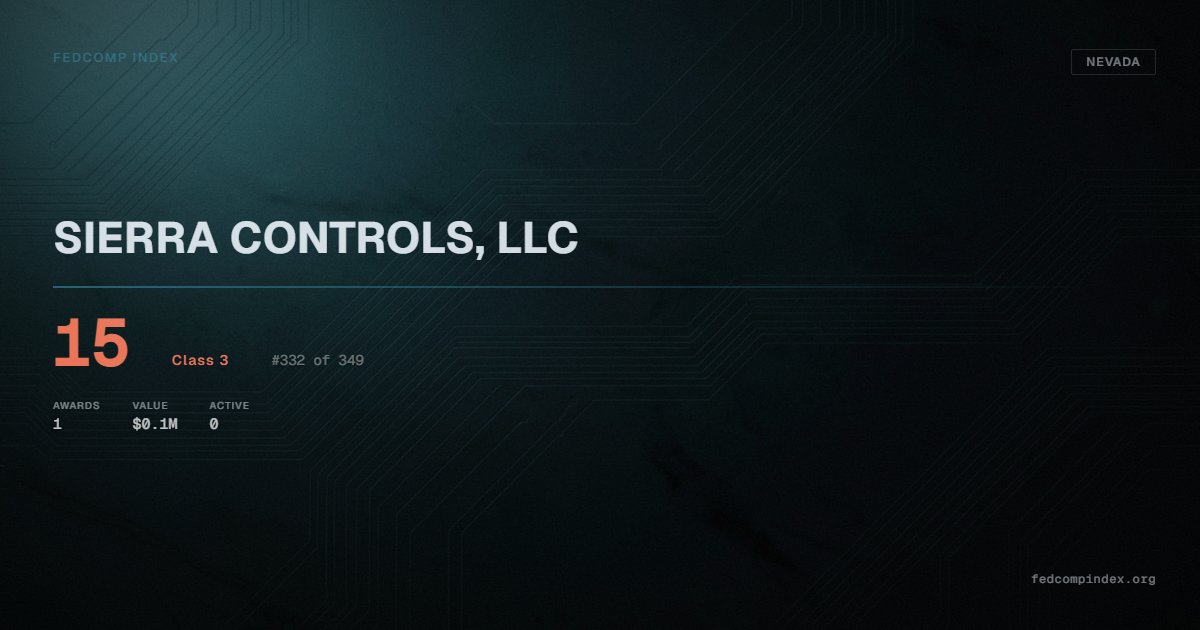 SIERRA CONTROLS, LLC holds position #332 among 349 Nevada federal contractors scored by the FedComp Index at 15. Contract records show $0.1M in federal awards over the five-year scoring window. All recorded awards come from Department of the Interior. Last recorded award dates to 2021. Top competitors by award overlap include SOFTWARE AND ENGINEERING ASSOCIATES INC and SFS CHEMICAL SAFETY INC.