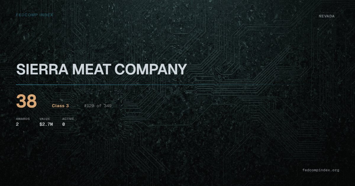 SIERRA MEAT COMPANY holds position #120 among 349 Nevada federal contractors scored by the FedComp Index at 38. Award records total $2.7M from 2 federal contracts over five years. All recorded awards come from Department of Agriculture. Last recorded award dates to 2023.