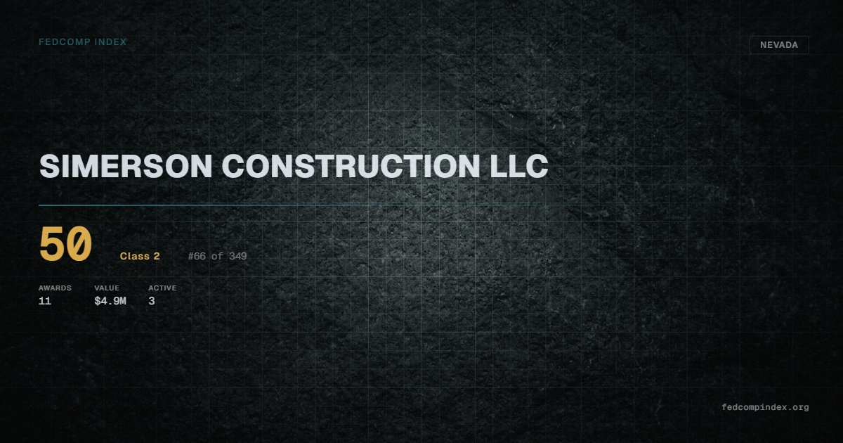 SIMERSON CONSTRUCTION LLC is a Nevada-based federal contractor ranked #66 of 349 with a FedComp Index score of 50. Award records total $4.9M from 11 federal contracts over five years. Awards span Department of Defense and Department of the Interior. 3 contracts currently active. Most recent award recorded in March 2026. Top competitors by award overlap include ARRIOLA CONSULTING & INSPECTIONS LLC and JAMES F THOMSON JR.