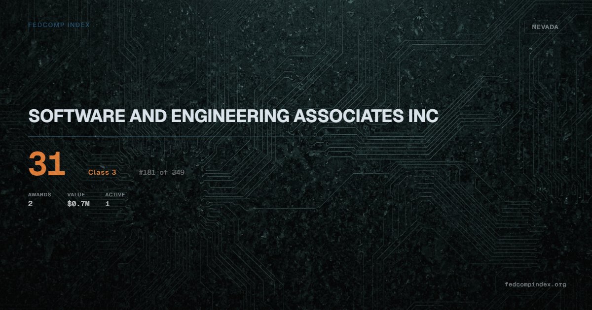 SOFTWARE AND ENGINEERING ASSOCIATES INC holds position #181 among 349 Nevada federal contractors scored by the FedComp Index at 31. Contract records show $0.7M in federal awards over the five-year scoring window. All recorded awards come from Department of Defense. One contract currently active. Last recorded award dates to 2023. Top competitors by award overlap include STRIKE SOLUTIONS LLC and SFS CHEMICAL SAFETY INC.