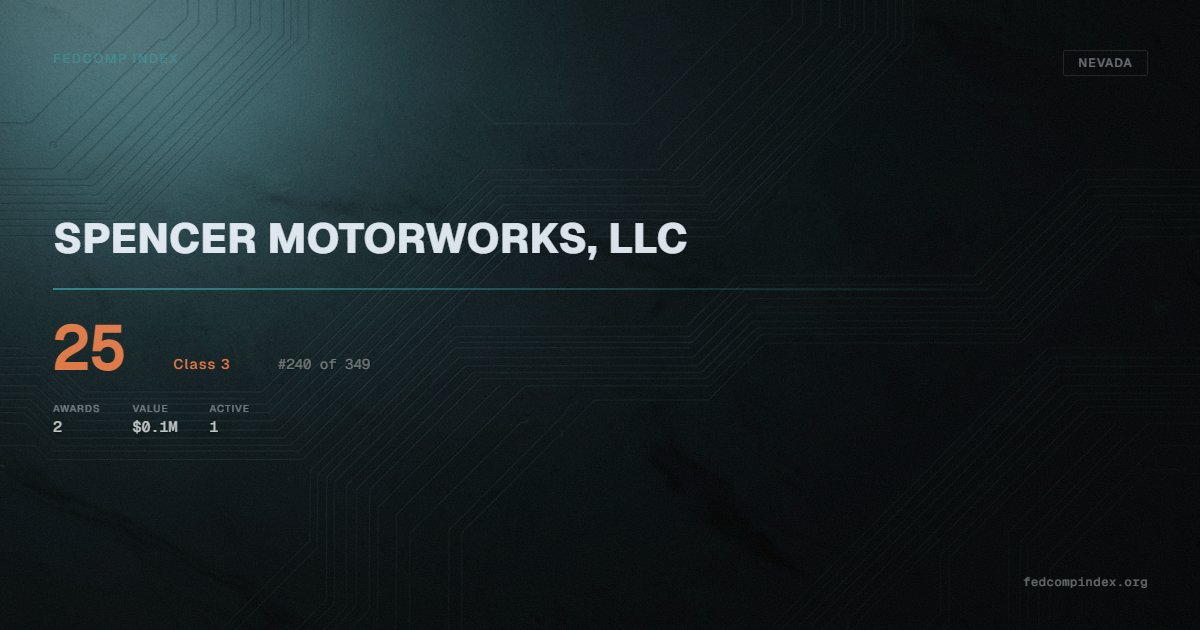 SPENCER MOTORWORKS, LLC holds position #240 among 349 Nevada federal contractors scored by the FedComp Index at 25. Contract records show $0.1M in federal awards over the five-year scoring window. Awards span Department of Agriculture and Department of the Interior. One contract currently active. Most recent award recorded in February 2026. Top competitors by award overlap include D & M EMERGENCY SERVICES INC and JBP LLC.