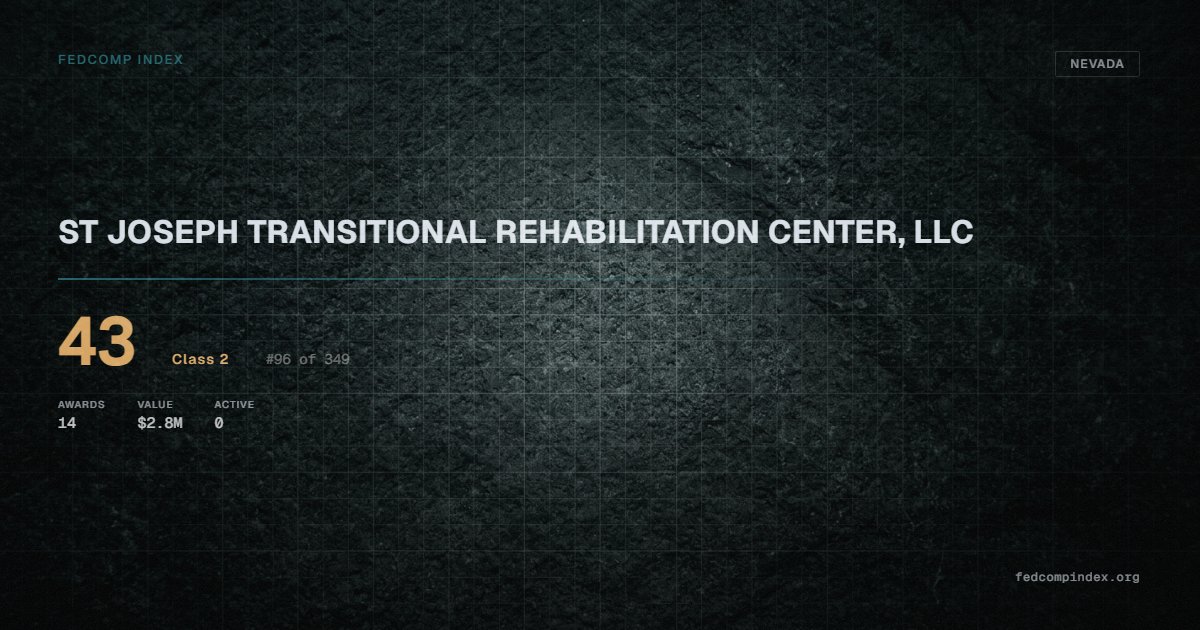 Ranked #96 among 349 Nevada federal contractors, ST JOSEPH TRANSITIONAL REHABILITATION CENTER, LLC carries a FedComp Index score of 43. Award records total $2.8M from 14 federal contracts over five years. All recorded awards come from Department of Veterans Affairs. Last recorded award dates to 2024. Closest competitor by award overlap is WILDCREEK HEALTHCARE, INC..