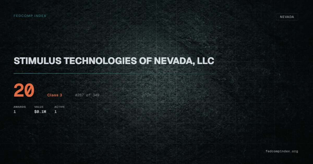 STIMULUS TECHNOLOGIES OF NEVADA, LLC holds position #287 among 349 Nevada federal contractors scored by the FedComp Index at 20. Contract records show $0.1M in federal awards over the five-year scoring window. All recorded awards come from Department of Defense. One contract currently active. Last recorded award dates to 2024. Closest competitor by award overlap is LIRA ELECTRIC, LLC.