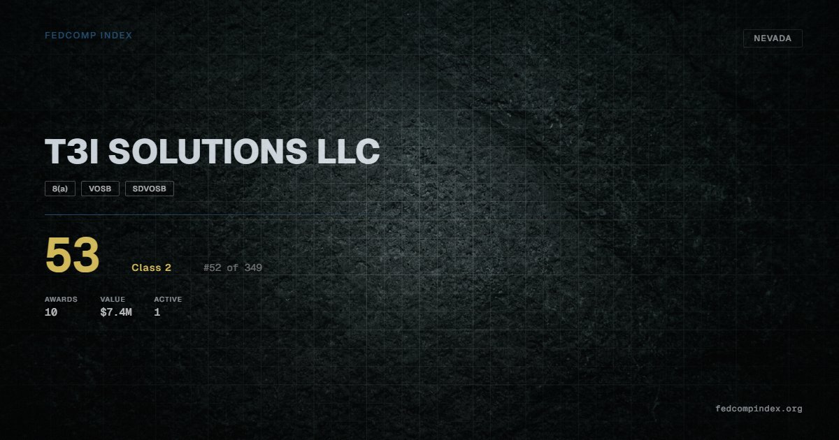 T3I SOLUTIONS LLC is a Nevada-based federal contractor ranked #52 of 349 with a FedComp Index score of 53. Award records total $7.4M from 10 federal contracts over five years. All recorded awards come from Department of Defense. SBA-certified as 8(a), VOSB, and SDVOSB. One contract currently active. Last award dated September 2025. Top competitors by award overlap include DELMAR AEROSPACE CORPORATION and CT3I LLC.