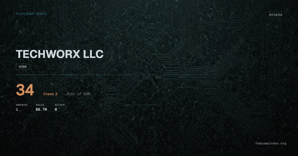 TECHWORX LLC holds position #152 among 349 Nevada federal contractors scored by the FedComp Index at 34. Contract records show $0.7M in federal awards over the five-year scoring window. All recorded awards come from Department of the Interior. Carries an active VOSB certification. Last recorded award dates to 2024. Top competitors by award overlap include VALLEY COMMUNICATIONS ASSOCIATION, LLC and SMART CITY NETWORKS, LIMITED PARTNERSHIP.