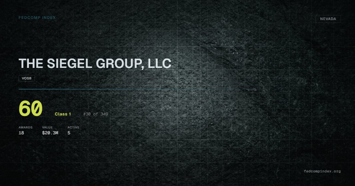 THE SIEGEL GROUP, LLC is a Nevada-based federal contractor ranked #33 of 349 with a FedComp Index score of 59. Federal contract history shows $17.2M across 17 awards in the past five years. Awards span Department of Defense and General Services Administration. Carries an active VOSB certification. Has 5 active contracts on record. Most recent contract activity from early 2025. Top competitors by award overlap include MY NEXT CAREER PATH STAFFING LLC and DPG SERVICES JV LLP.