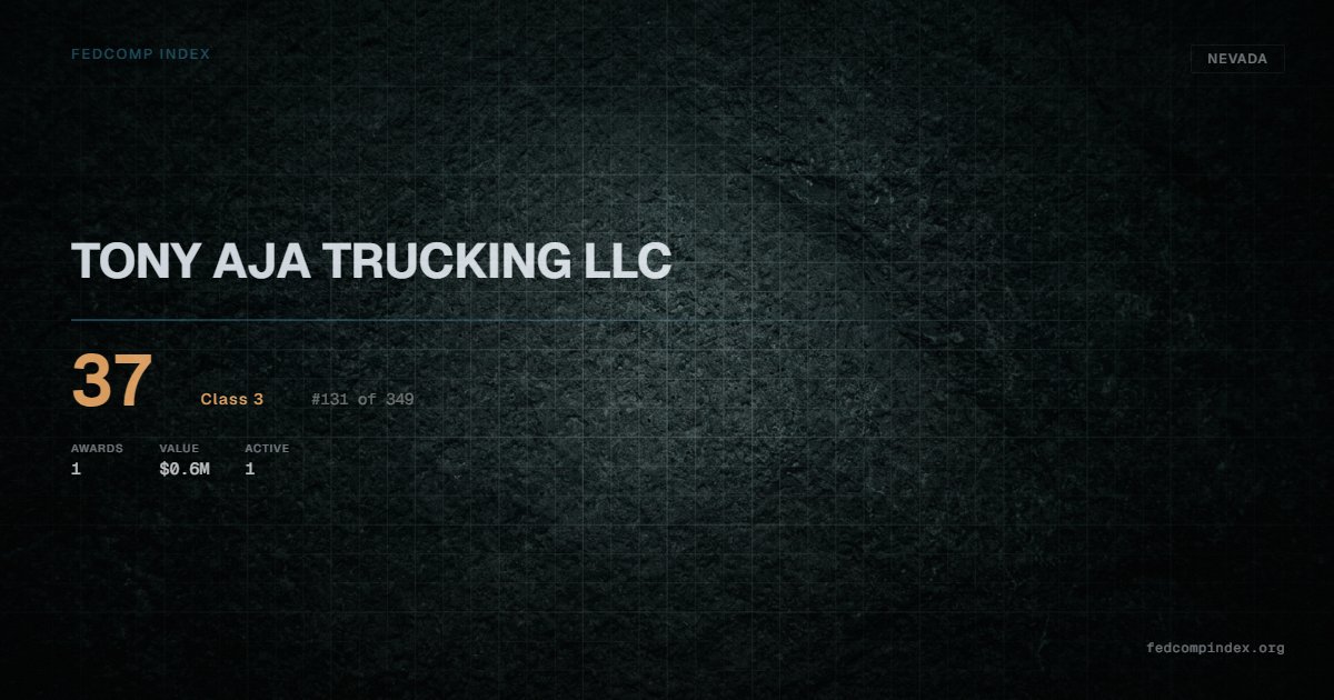 TONY AJA TRUCKING LLC holds position #131 among 349 Nevada federal contractors scored by the FedComp Index at 37. Contract records show $0.6M in federal awards over the five-year scoring window. All recorded awards come from Department of the Interior. One contract currently active. Last award dated September 2025. Closest competitor by award overlap is KAMTEC INC.