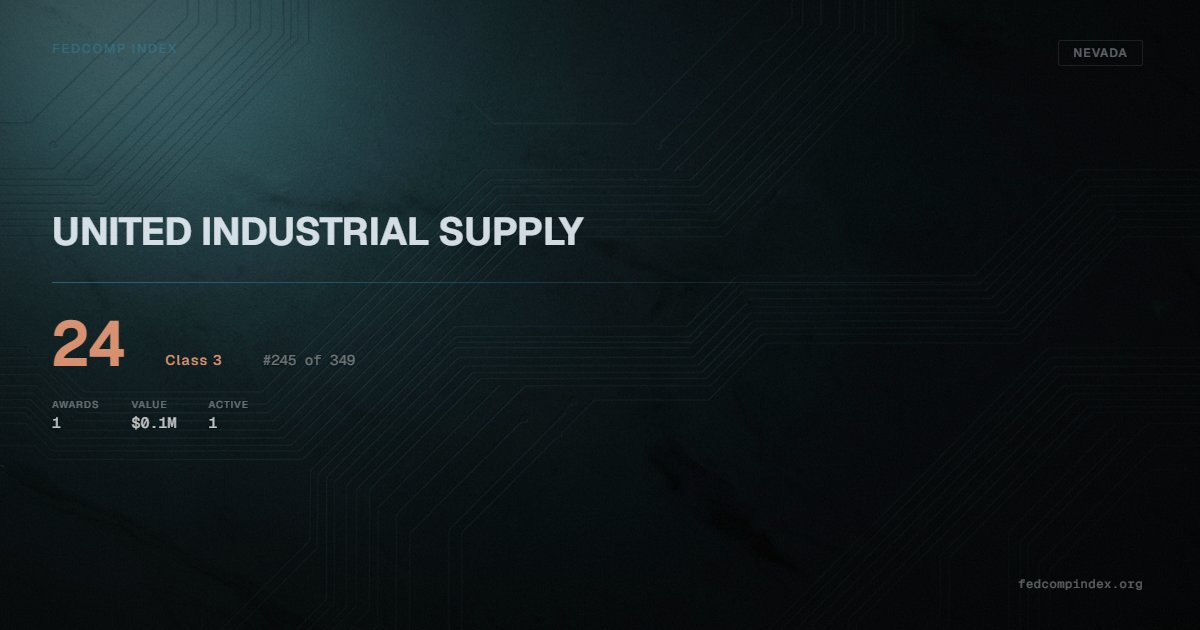 UNITED INDUSTRIAL SUPPLY holds position #245 among 349 Nevada federal contractors scored by the FedComp Index at 24. Contract records show $0.1M in federal awards over the five-year scoring window. All recorded awards come from Department of Veterans Affairs. One contract currently active. Most recent contract activity from early 2025. Closest competitor by award overlap is MARVEL WATER LLC.