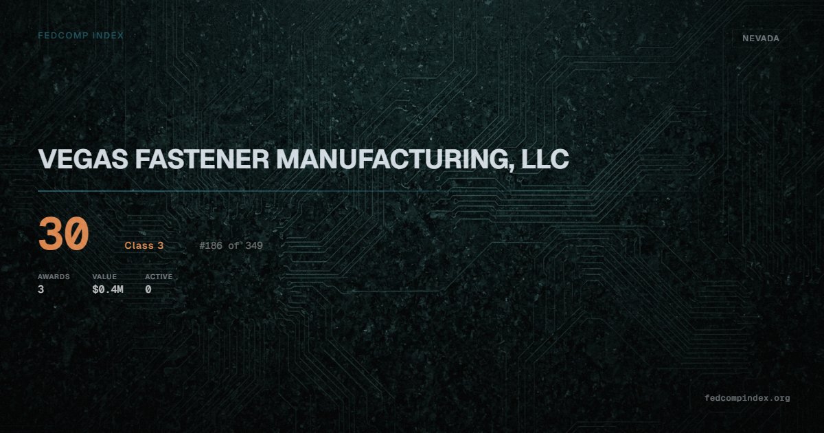 VEGAS FASTENER MANUFACTURING, LLC holds position #186 among 349 Nevada federal contractors scored by the FedComp Index at 30. Contract records show $0.4M in federal awards over the five-year scoring window. All recorded awards come from Department of Defense. Most recent contract activity from early 2025. Closest competitor by award overlap is ALPINE FASTENER & HARDWARE INC..