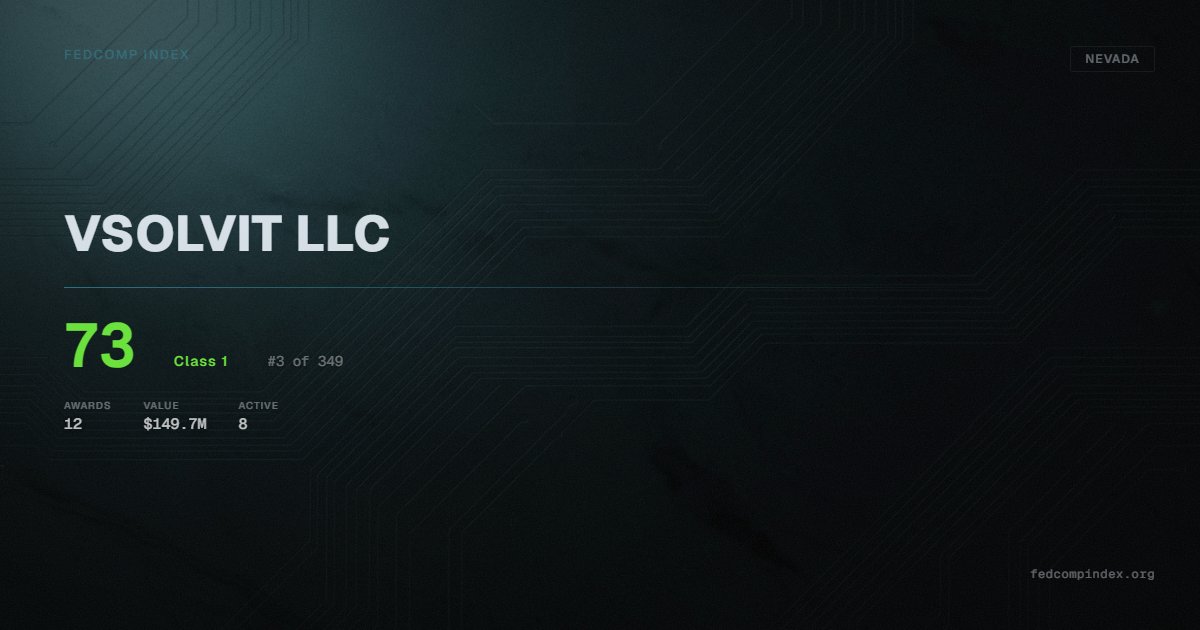 VSOLVIT LLC scores 73 out of 100 on the FedComp Index, ranking #3 of 349 scored Nevada contractors. Five-year federal contract volume totals $149.7M from 12 awards. All recorded awards come from Department of Defense. Has 8 active contracts on record. Last award dated July 2025. Top competitors by award overlap include PUYENPA SERVICES, LLC and INTEGRATED DATA SERVICES, LLC.