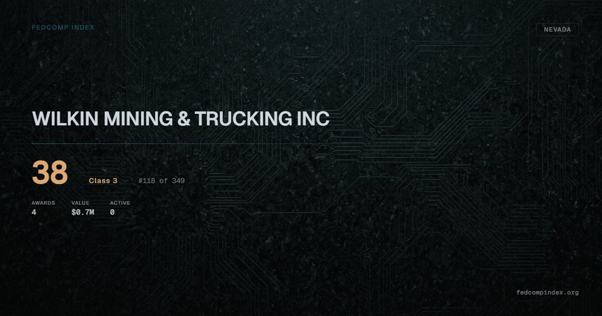 WILKIN MINING & TRUCKING INC holds position #118 among 349 Nevada federal contractors scored by the FedComp Index at 38. Contract records show $0.7M in federal awards over the five-year scoring window. All recorded awards come from Department of Agriculture. Last award dated July 2025. Top competitors by award overlap include HENDON, DOUGLAS H and ROADWAY COMPANY.