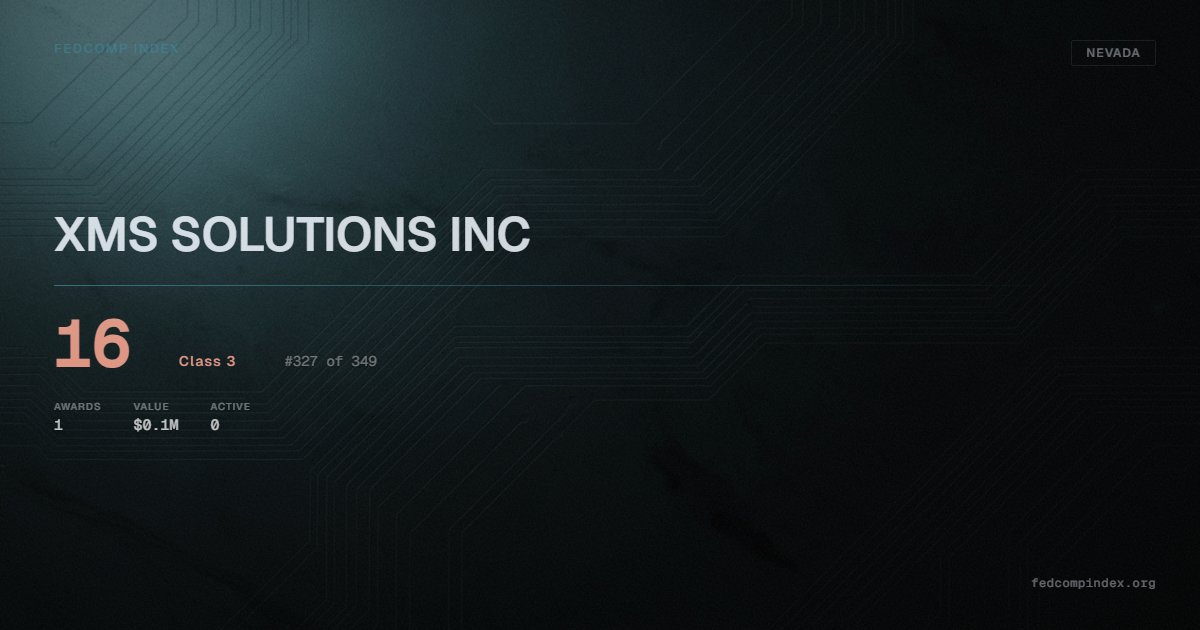 XMS SOLUTIONS INC holds position #327 among 349 Nevada federal contractors scored by the FedComp Index at 16. Contract records show $0.1M in federal awards over the five-year scoring window. All recorded awards come from Department of the Treasury. Last recorded award dates to 2021. Top competitors by award overlap include BLACKPOINT LLC and COMPLETE DOCUMENT MANAGEMENT SOLUTIONS, INC..